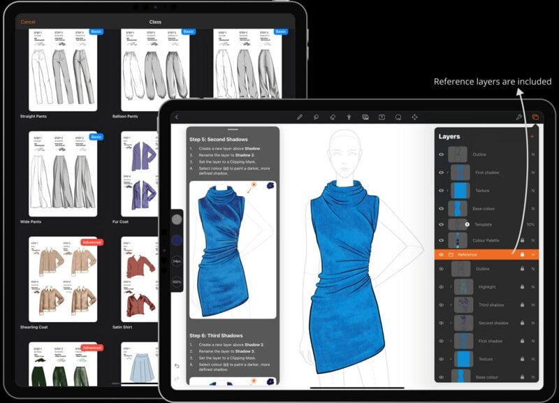 Start by practicing fashion figure drawing (croquis). Many apps include figure templates that you can trace or modify. This helps you understand anatomy and movement while keeping proportions consistent.